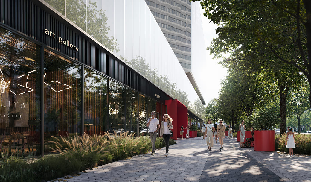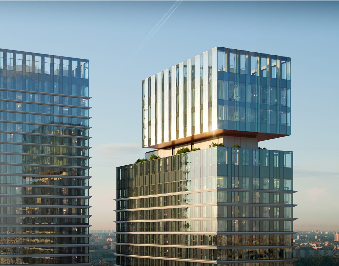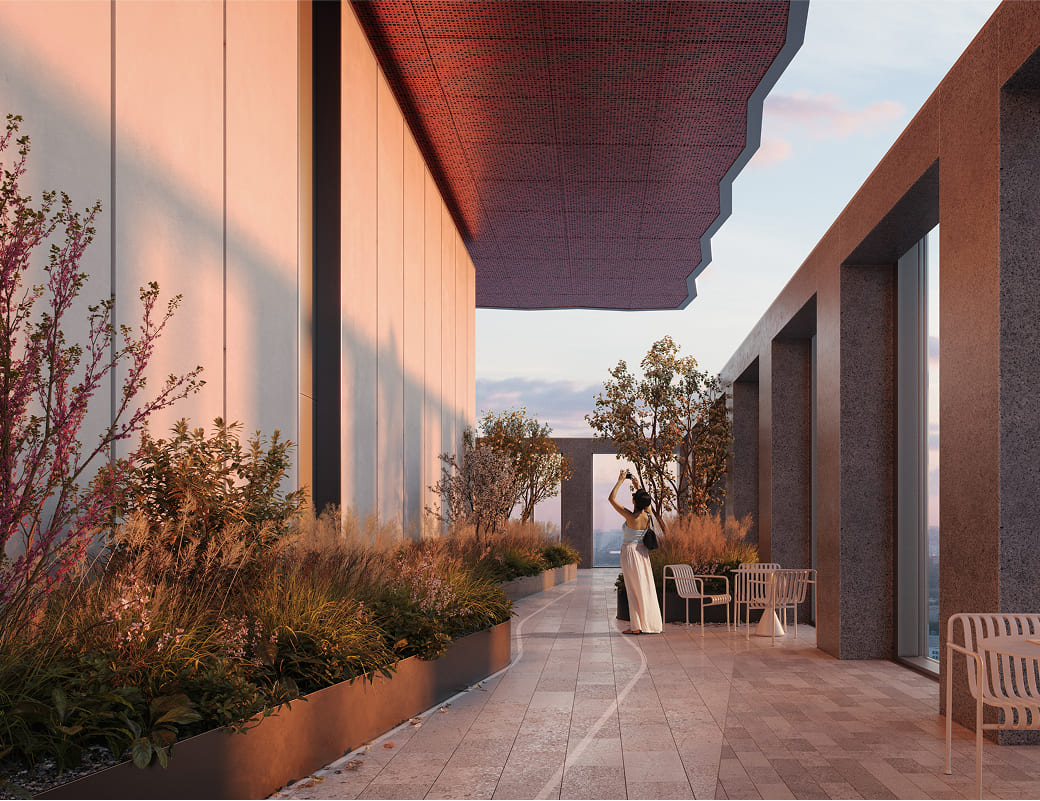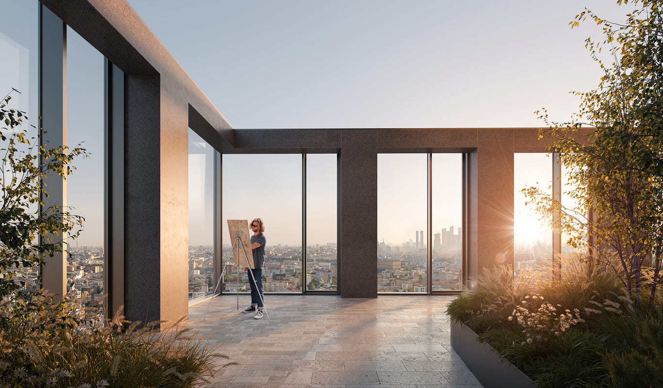 Вершиной благоустройства станет панорамный лаунж на высоте более 140 метров с зоной для йоги и смотровой площадкой для спокойного отдыха. Над ней разместятся пентхаусы. Визуально такое решение создаст эффект парения верхнего объема башни и наполнит проект духом современного искусства, превращая здания в локальный арт-объект, притягивающий взгляды.