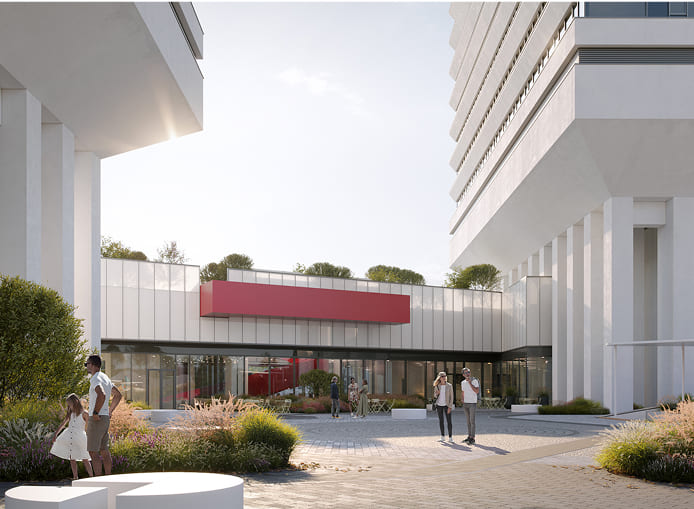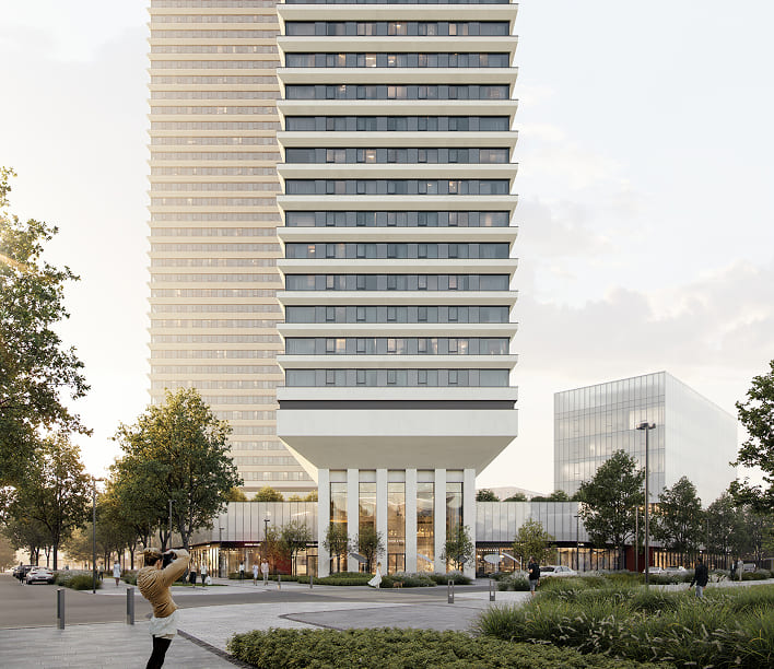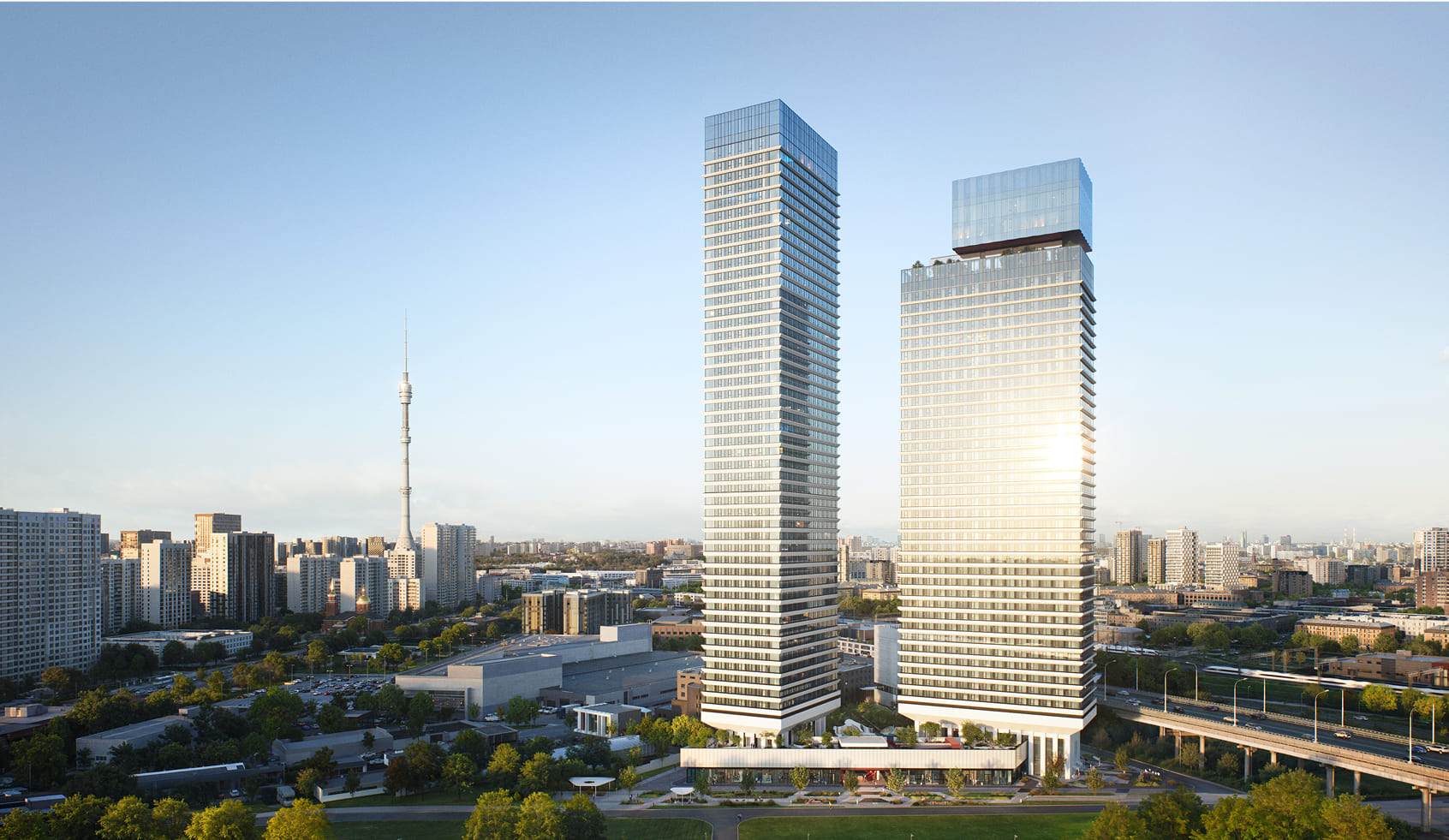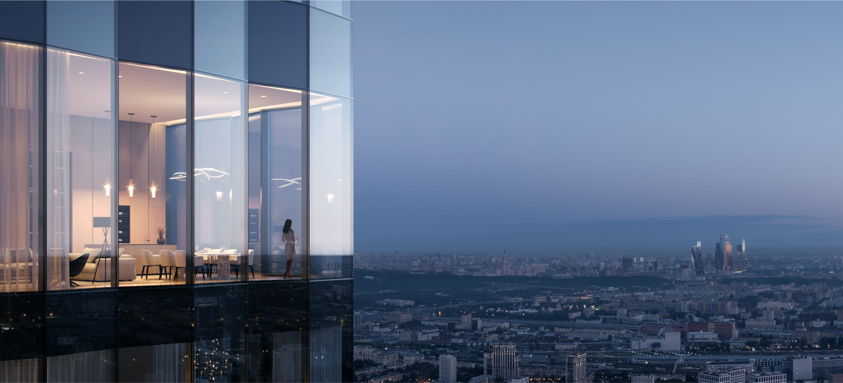 Вершиной благоустройства станет панорамный лаунж на высоте более 140 метров с зоной для йоги и смотровой площадкой для спокойного отдыха. Над ней разместятся пентхаусы. Визуально такое решение создаст эффект парения верхнего объема башни и наполнит проект духом современного искусства, превращая здания в локальный арт-объект, притягивающий взгляды.
