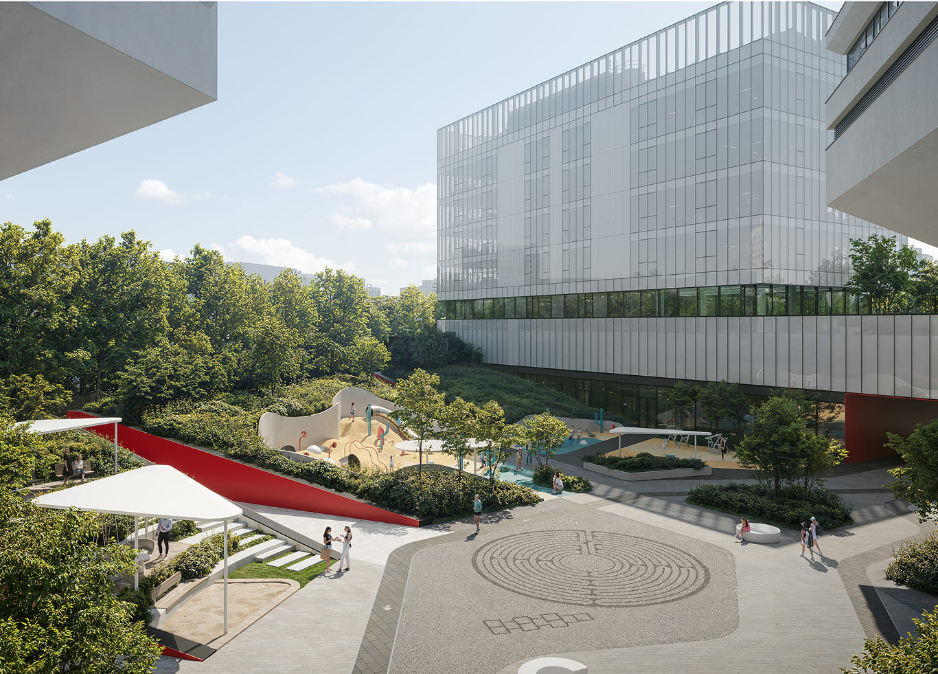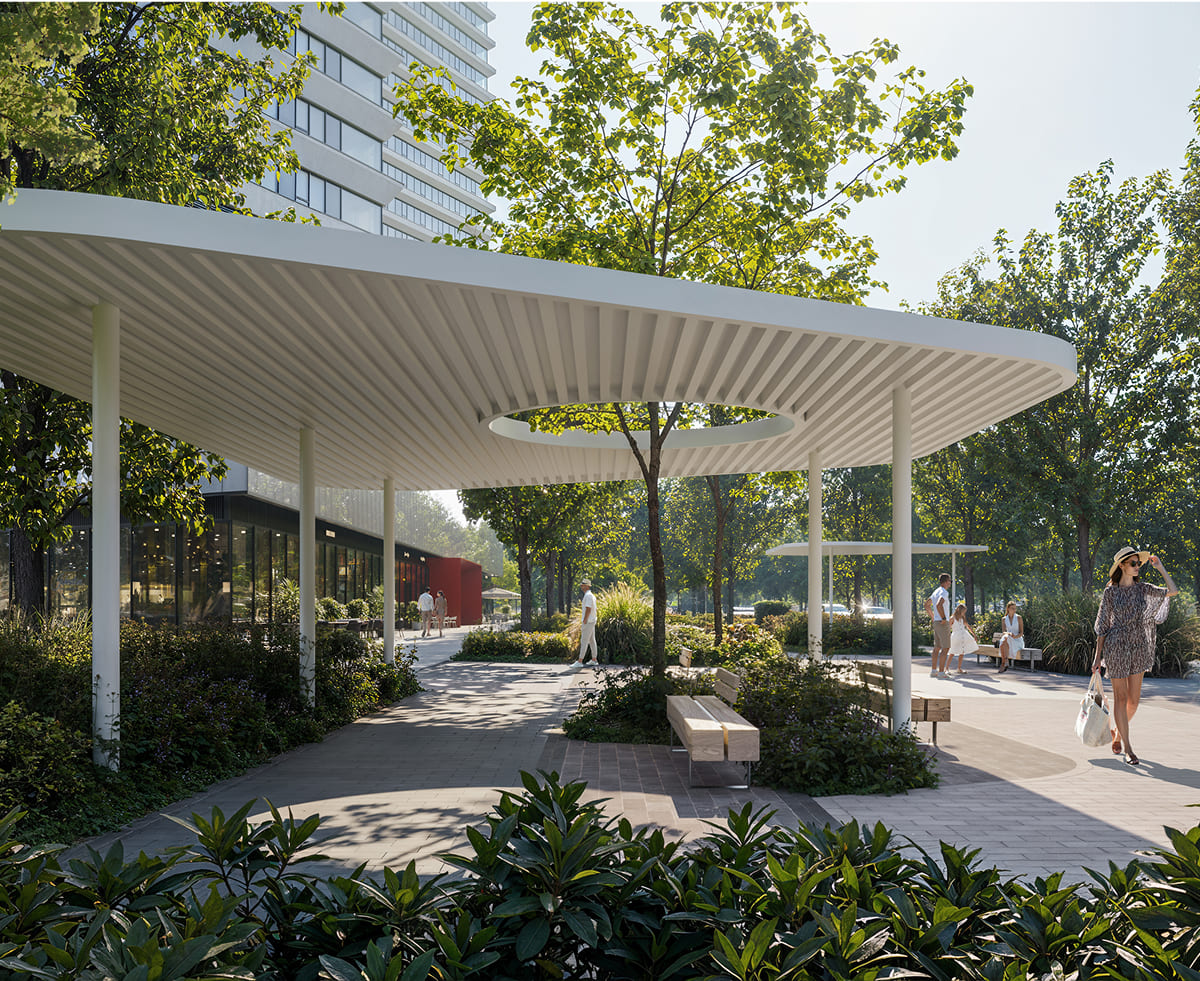 Для такого уникального проекта известное бюро Wowhaus создало нестандартный подход к благоустройству: под общественные зоны выделена не только территория внутреннего двора, но и кровля стилобата, объединяющего здания.