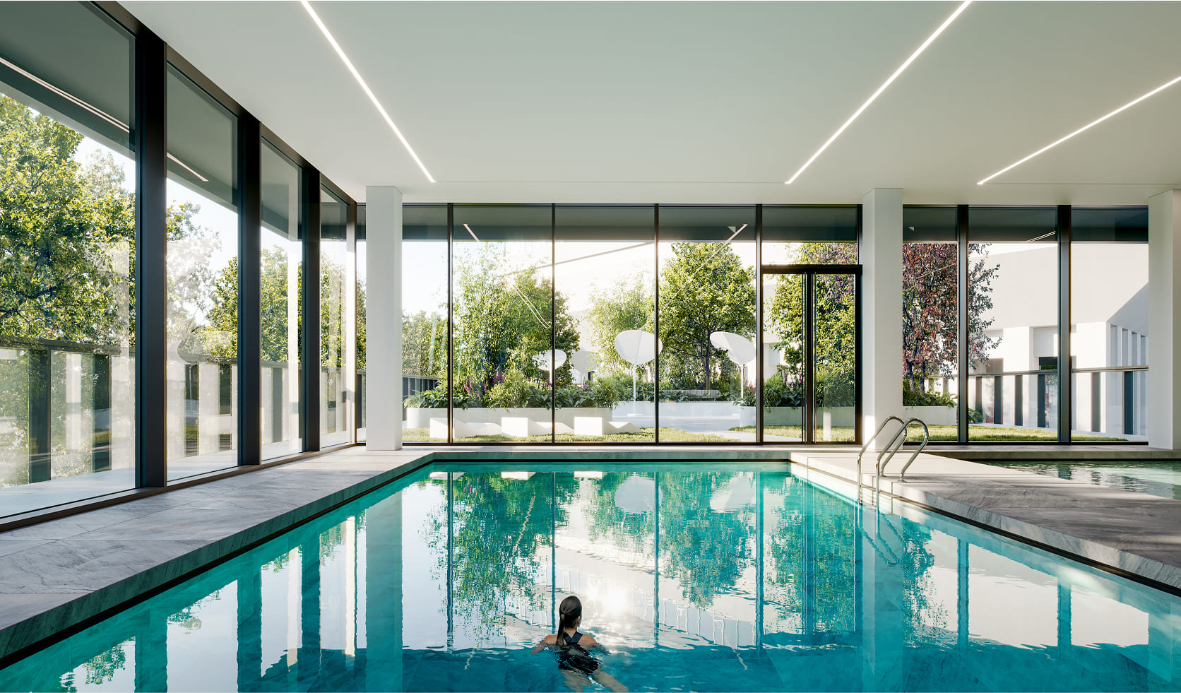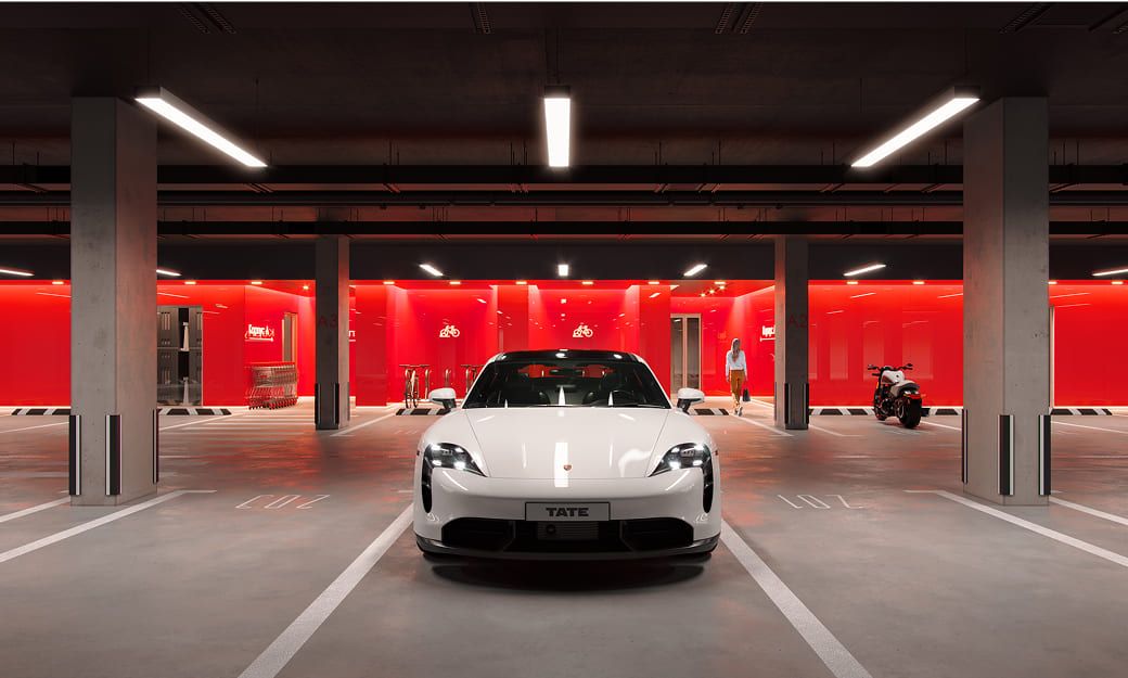 Подземный паркинг на 545 машино-мест, с зарядками для электромобилей. Фитнес-центр с 25-метровым бассейном и спа-зонами.