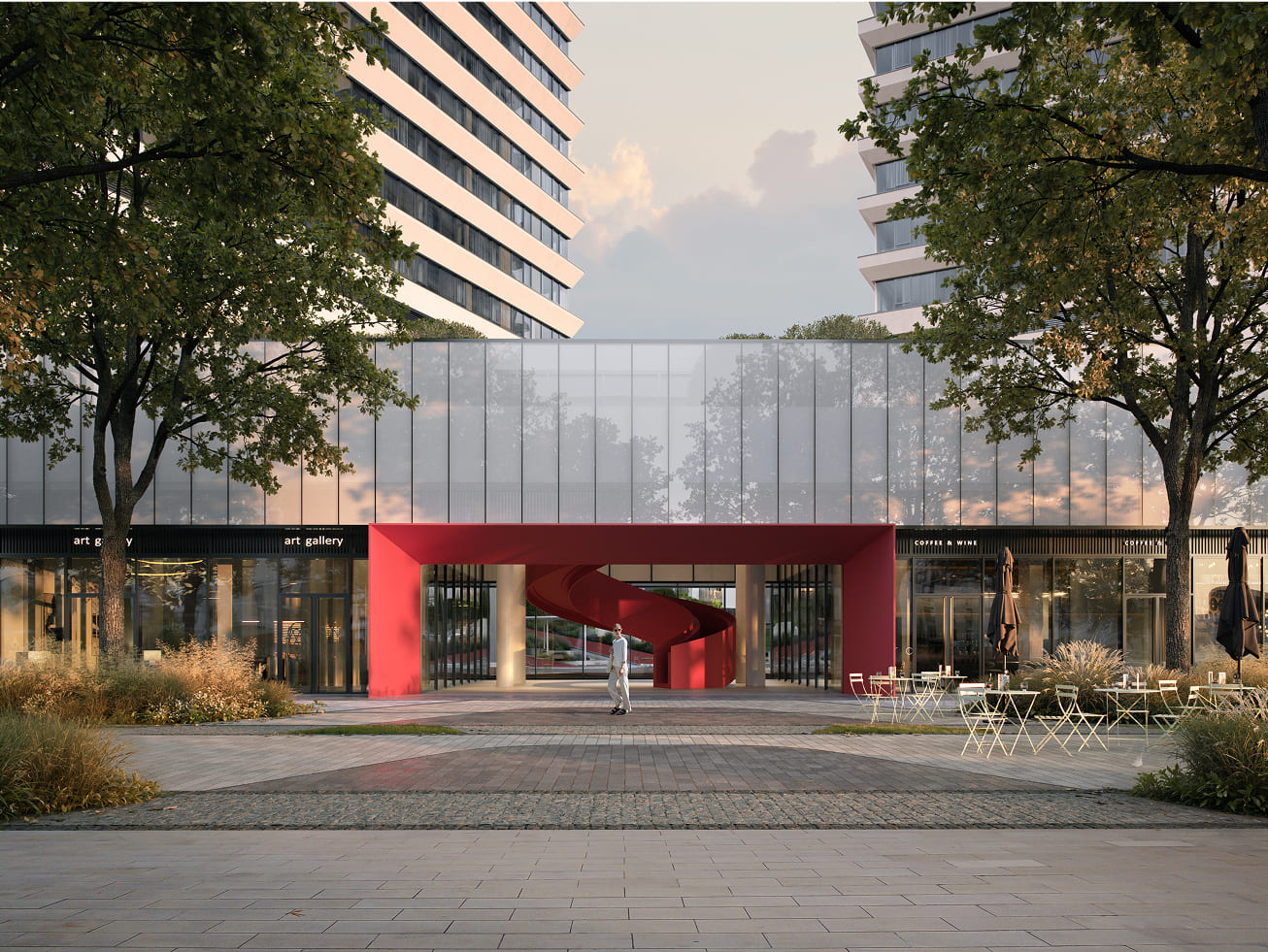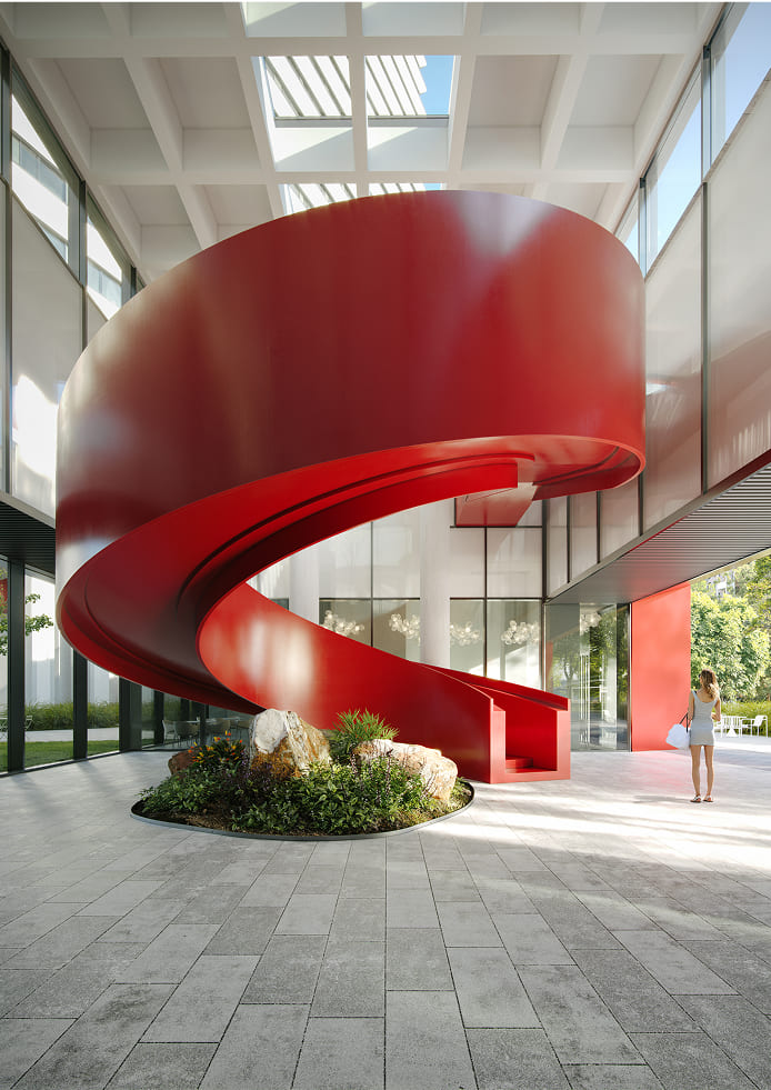 С первого этажа галереи по акцентной красной винтовой лестнице, которая сама станет авангардным арт-объектом, можно будет подняться на эксплуатируемую кровлю с зеленой зоной для отдыха под открытым небом.